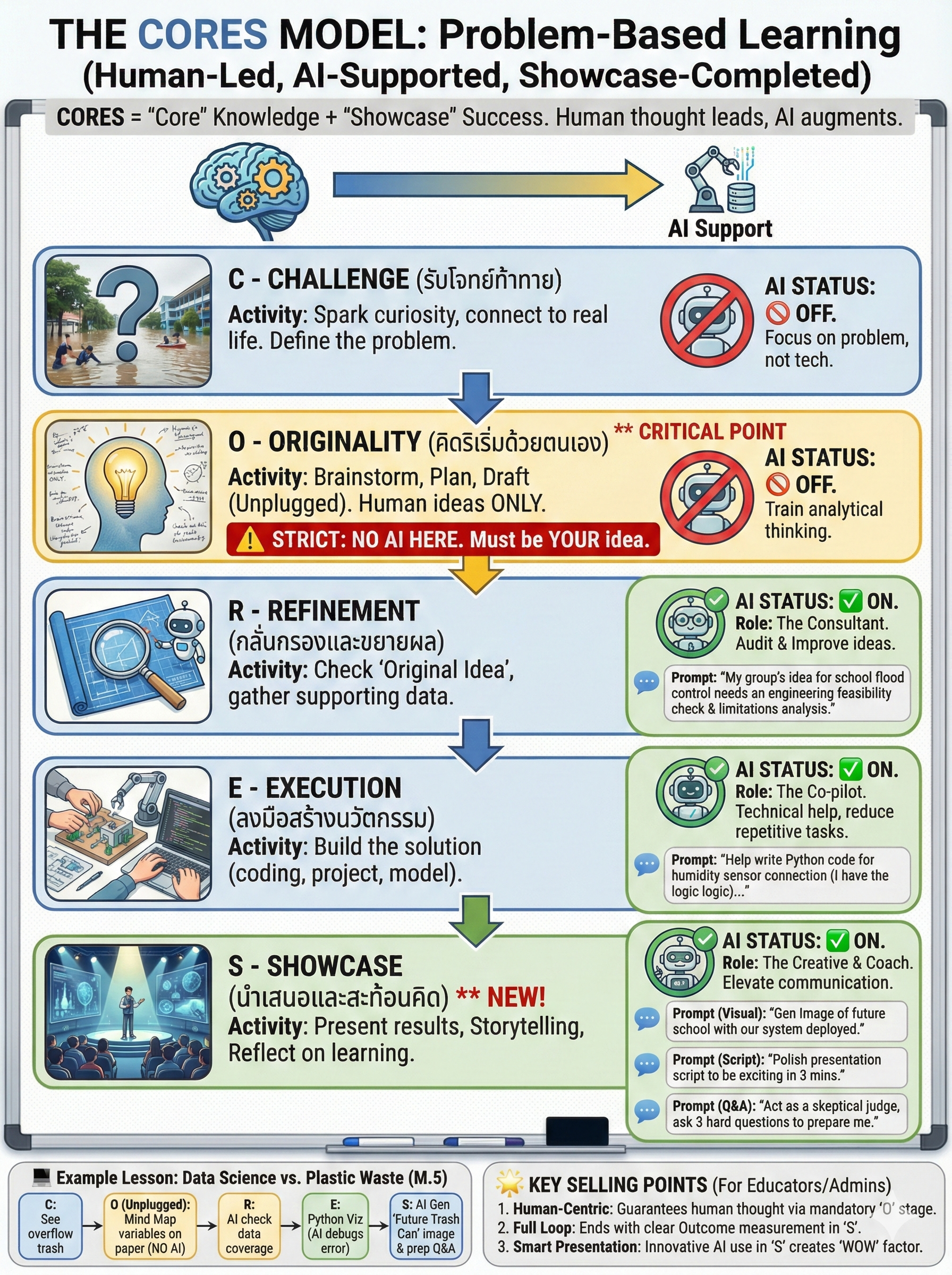 คอนเซปต์ของโมเดล คือ “มนุษย์คิดนำ เอไอหนุนเสริม” (Human-Led, AI-Supported) เป็นการเรียนรู้โดยใช้ปัญหาเป็นฐาน (PBL) ที่ออกแบบมาเพื่อยุค AI โดยเฉพาะ เพื่อให้มั่นใจว่านักเรียนของเราจะยังมี “แก่น (Core)” ของความรู้ที่แน่นปึ้ก และสามารถ “ฉายภาพ (Showcase)” ความสำเร็จนั้นออกมาได้อย่างงดงาม
