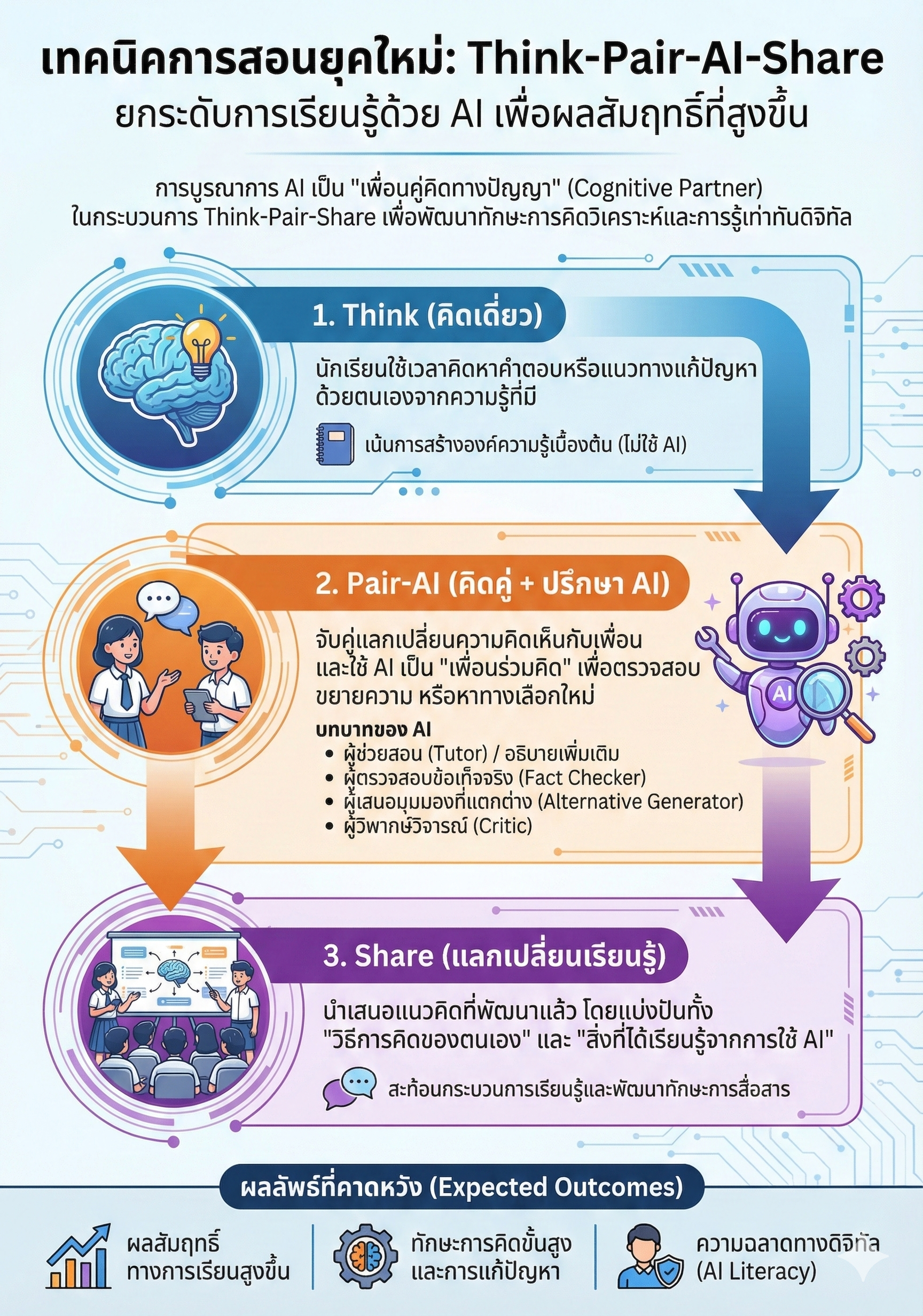 | 2 | Pair (คิดคู่ / คู่กับ AI) | 1. แชร์: แลกเปลี่ยนความคิดเห็นกับเพื่อน 2. ปรึกษา AI: ใช้ AI (เช่น ChatGPT/Gemini) ตรวจสอบ, วิจารณ์, เสนอทางเลือก, หรือ หาคำตอบ ที่ตนเองสงสัย จนได้ข้อสรุปที่ดีกว่าเดิม | AI As a Cognitive Partner: ทำหน้าที่เป็นผู้ช่วยสอน (Tutor), ผู้ตรวจสอบข้อเท็จจริง (Fact Checker), และผู้เสนอทางเลือกใหม่ (Alternative Generator) | การพัฒนาความเข้าใจ (Critical Thinking & Inquiry-based Learning) |