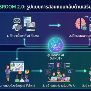 | 3 | Share (คิดร่วมชั้น) | นำเสนอ 1. วิธีการคิดดั้งเดิม 2. สิ่งที่ได้เรียนรู้จาก AI และ 3. ข้อสรุป/ผลงานสุดท้ายที่พัฒนาแล้ว ให้เพื่อนร่วมชั้นฟัง | AI As a Summarizer: อาจใช้ AI สรุปประเด็นหลักที่แชร์กันในชั้นเรียน หรือสร้างแผนผังความคิด (Mind Map) | การสะท้อนการเรียนรู้ (AI Reflection Log & Metacognition) |