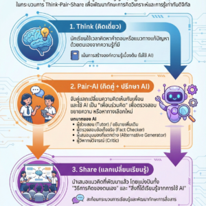 ⚙️ ความหมายและจุดเน้น Think-Pair-AI-Share คือกลยุทธ์ Active Learning ที่พัฒนามาจาก Think-Pair-Share โดยบูรณาการ AI เข้ามาเป็น “เพื่อนร่วมคิดทางปัญญา (Cognitive Partner)” ในขั้นตอน Pair เพื่อช่วยผู้เรียนตรวจสอบแนวคิด ค้นหาทางเลือก และพัฒนาความเข้าใจให้ลึกซึ้งก่อนการแบ่งปันในชั้นเรียน เป้าหมายหลัก: พัฒนาทักษะ AI Literacy: ฝึกให้ผู้เรียนใช้ AI อย่างมีวิจารณญาณและสร้างสรรค์ เพิ่มผลสัมฤทธิ์ทางการเรียน:…